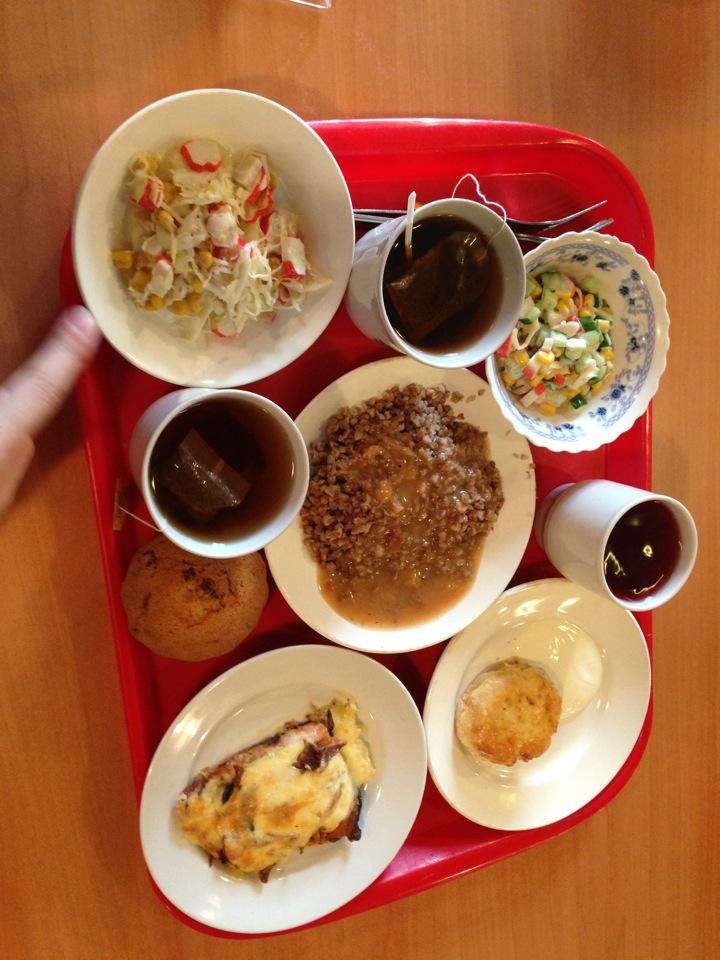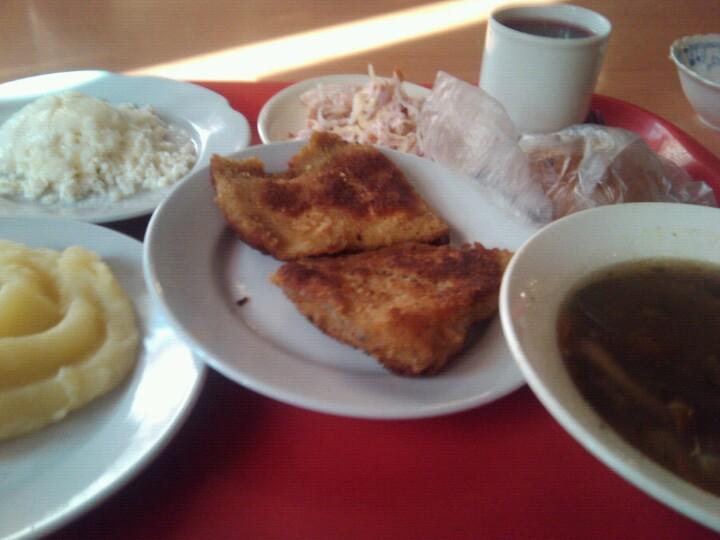 Дешево. Макароны 10р, рис 15, гречка 17. Борщ 30р, котлета 55, рыба запеченная 50р, салаты 25-40р. Пирожки по 10р. Но как то не особо вкусно(